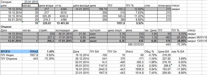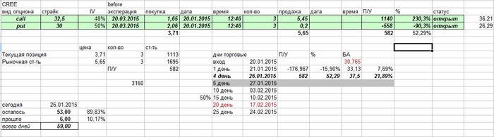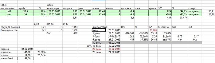 Были куплены 2-х месячные опционы колл и пут. Дата открытия 20/01/15 Текущий результат +50% Позицию буду держать до тех пор пока развивается ситуация в акции.