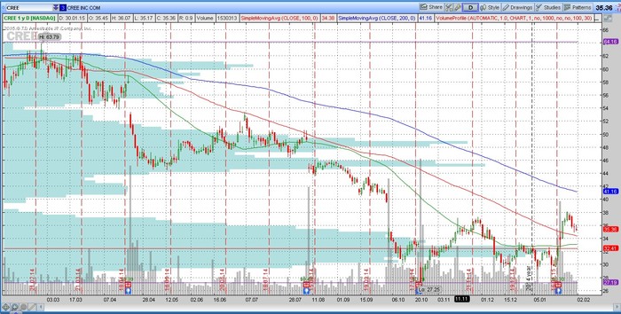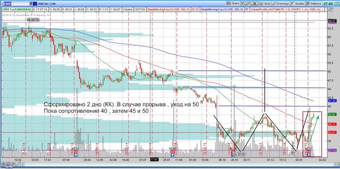 Что касается стратегии по опционам на акцию CREE, после удержания позиции в течении 5 дней результат все еще не плохой 37,5% , но хуже чем был. Акция не смогла уйти выше 38 и в данный момент уходит ниже 36. Это плохо отразится на опционной комбинации и скорее всего результат будет в Пн около нуля. Буду работать над позицией , если акция возобновит рост , оставлю все как есть, если пойдет ниже буду работать над позицией и скорее всего добавлять опцион на понижение.