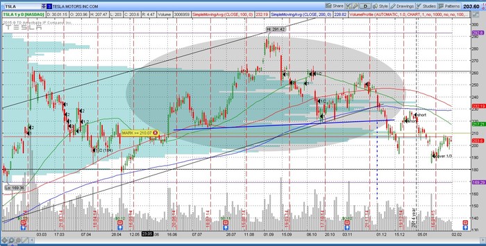 Акция консолидируется чуть ниже уровня 210 и немного не дотянула до него, поэтому мне не удалось нарастить позицию. Рынок в целом слабый и больше склонен к снижению чем к росту. Поэтому TSLA и без того слабая также находится под давлением.