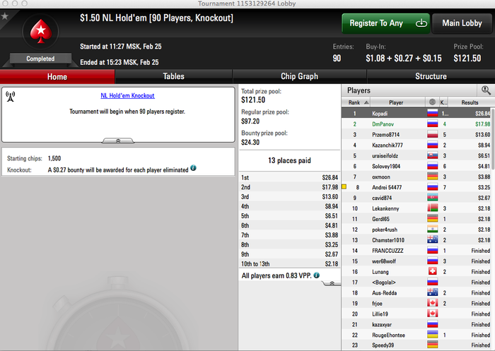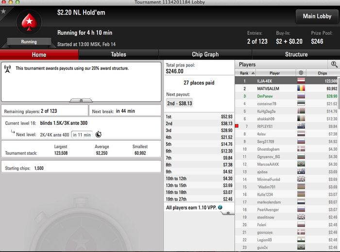 NewDimix, ааа об этом ))) мне очень понравился этот турнир. Первый раз играл его дошел до итм, слетел на двадцать шестом что ли месте, причем дошел до него получая удовольствие от игры. Адекватные оппоненты, структура то что надо и на роду не много...призовые хорошие, есть стимул.