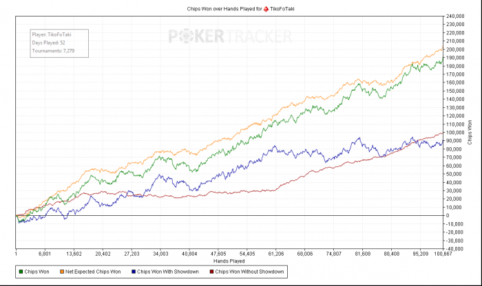 Правда стоит признать, что по-большей части это всё же 7ки из-за недостаточного банкролла. И так всё не гладко, не хочу ещё дополнительную дисперсию вводить в виде короткого банкролла =) В связи с несколькими ккэш-аутами ещё некоторое время буду гриндить 7ки. Думаю 100 би достаточно для перехода выше.