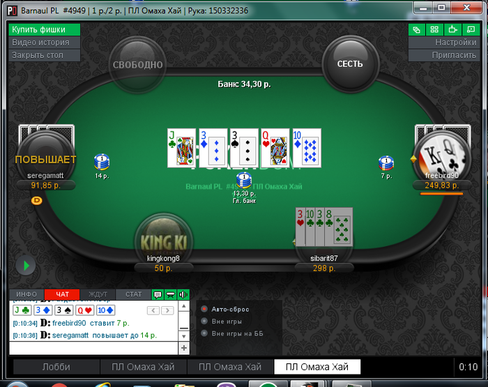 Омаха хорошая игра) Не дает относительно долго заблуждаться относительно уровня твоей - быстро и жестко ставит на место. Вроде как только что-то начало получаться, банкрольчик достиг отметки 30 байинов следующего лимита, решил шотнуть на ПЛО10 и на нах - заливаешь 5 байинов, получив недобор в 3, возвращаешься вниз, а тут все продолжается: