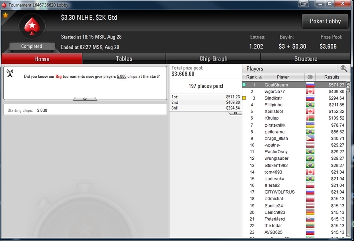 Poker Stars, $4 Buy-in (50/100 blinds, 10 ante) No Limit Hold'em Tournament, 8 Players
