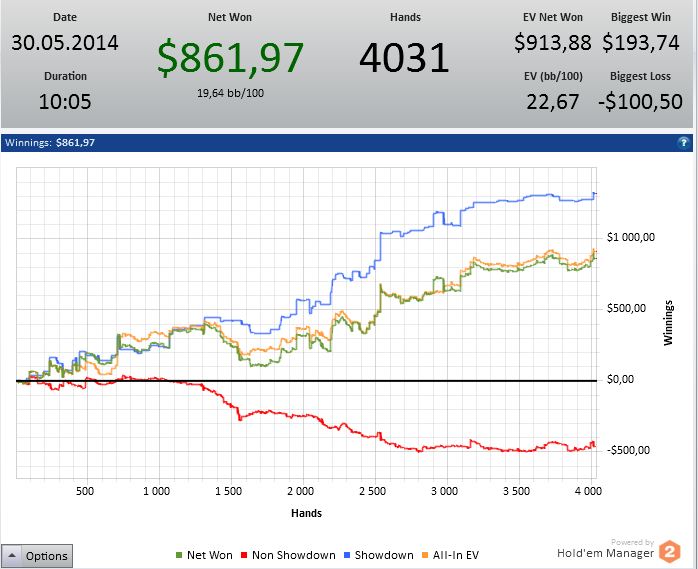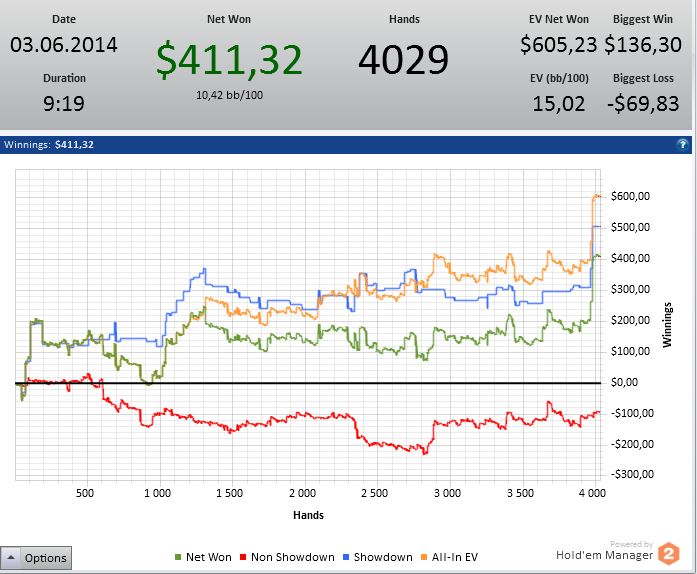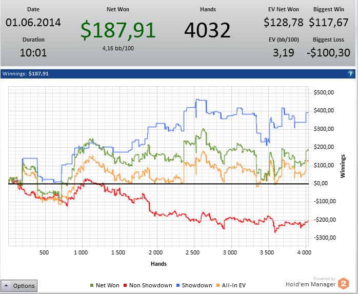 В самом начале сессии играл на автопилоте, концентрации вообще не было. Потом пошёл вмазал две чашки кофе и меня "отпустило", катал в лучший свой покер. В конце сессии устал очень и уже тупо доигрывал нужную дистанцию.