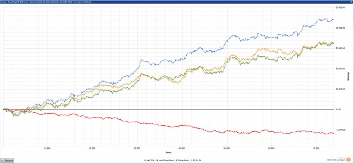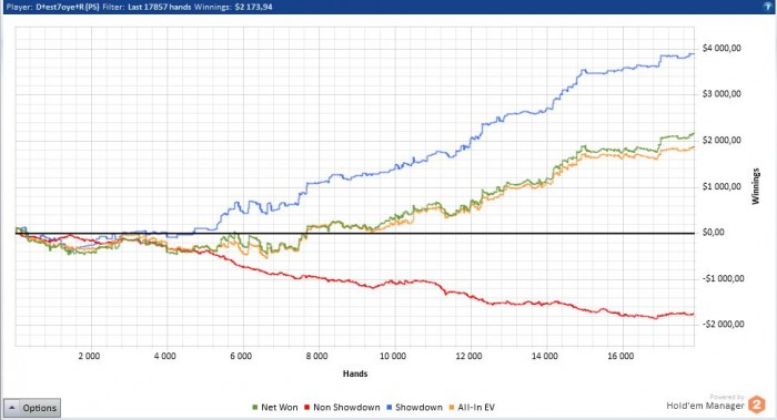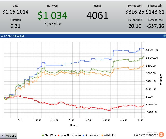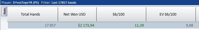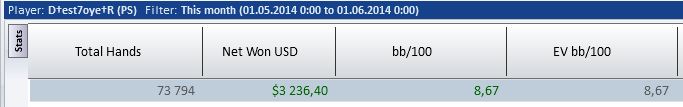 Все поставленые перед собой цели выполнил, дистанция 91,6к рук не может не радовать в прошлом месяце только 60к жопа ленивая. В конце месяца перешел на нл100 и пытаюсь там закрепится, борюсь в основном с психологией, деньги давят очень. Месяц в плане профита выдался лучшим в карьере, и я даже немного тильтую по этому поводу. Главное не почевать на лаврах, откатывать макс дистанции и уделять время теории хотя я её ппц как ненавижу. В сл месяце так же выложиться по максимуму уже лето, какой наф покер, солнце море и тёлки