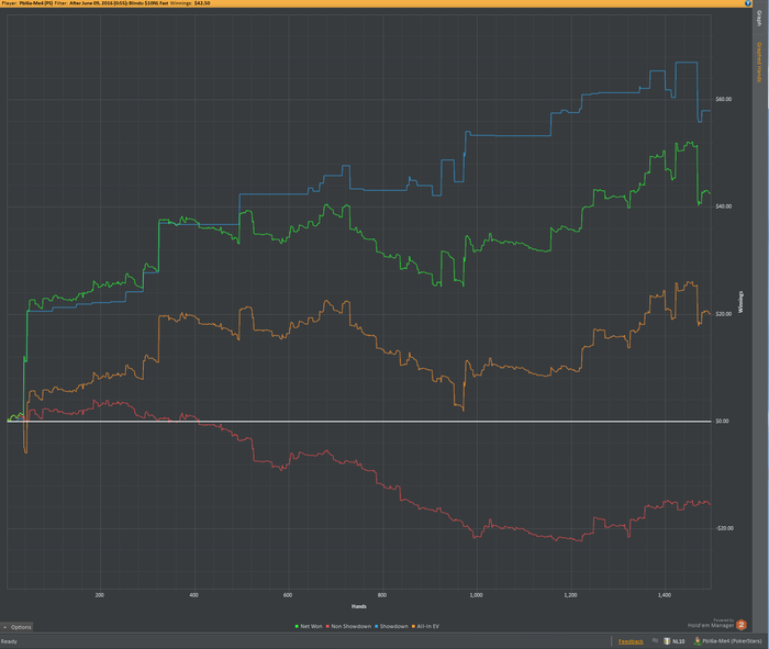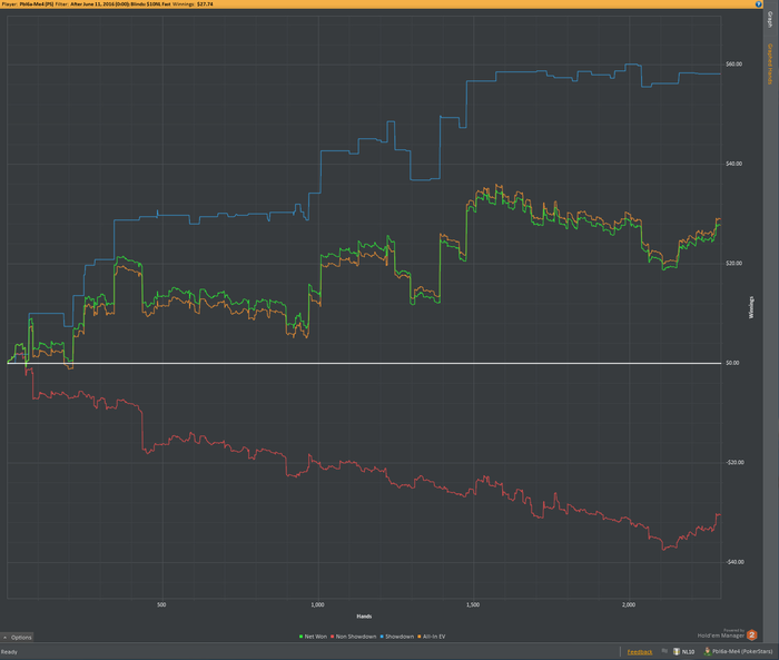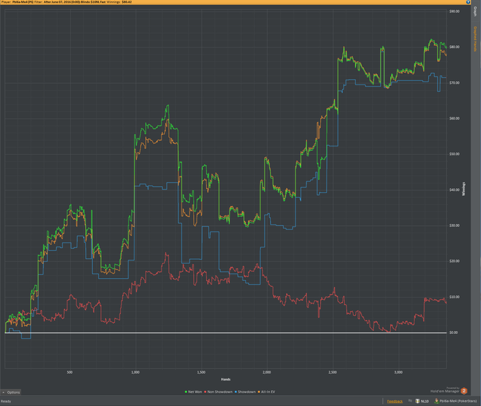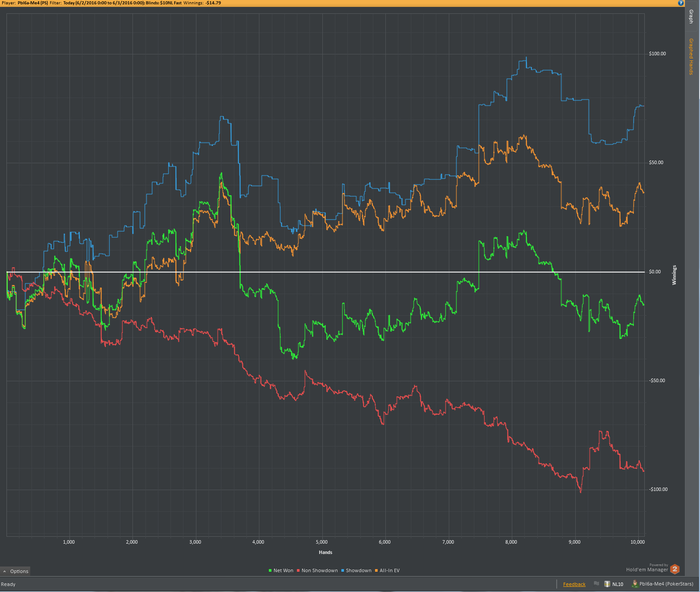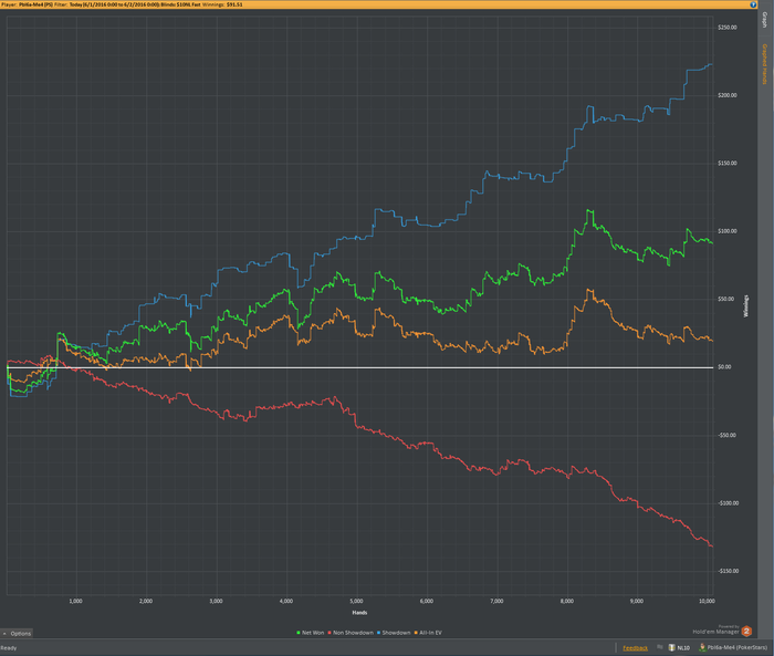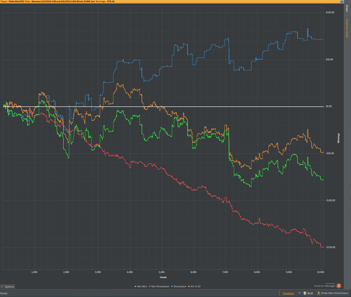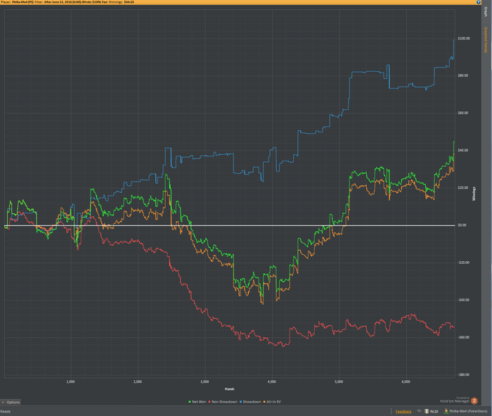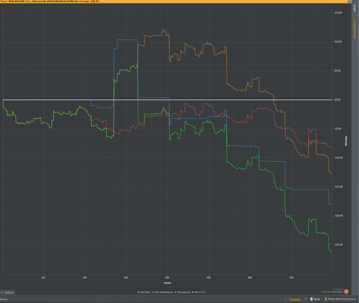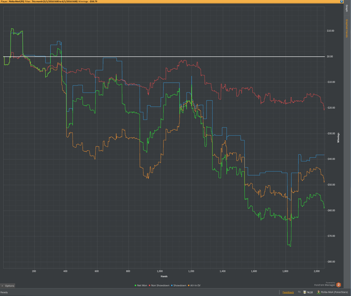 За последние 3 года я не припомню настолько унылого месяца. Я просто в ахуе от самого себя, ну как, блять, как так можно. Вот тебе и доллар в 2 раза больше чем всегда был, фиши на нл10 как были таки остались, в стране с работой и з\п пиздец - катай только, чуть по ответственней относись к делу. Нет - хуй там был, буду нихуя не делать, смотреть хоккей, спать по 14 часов в день, искать каждый день отмазки, но только не катать\работать над игрой. А БР то тает, фрироллы только и спасают, 2 таких фриролла дали 175$ к сегодняшнему БР, это очень неплохо, однако на одних фриролла далеко не уедешь, к тому же больше билетов на них нету. Что же делать? Будь что будет уже. Я навряд ли смогу кардинально изменится сам и изменить свою игру, по этому никаких ни планов, ни задач. Лишь данный дневничек дает хоть какой-то повод катать и не забить на покер окончательно.