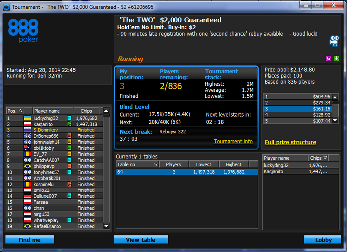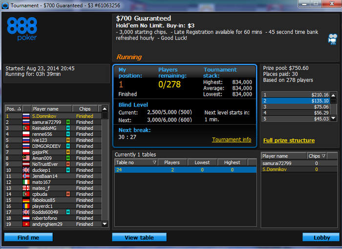 Сделал финалку на патипокере, на счету оставалось 14$ думаю залудю и покину шарашку, а тут счастье привалило выйграл 160$. Теперь хз продолжать лудить там или месяц потратить чтобы их вывести.