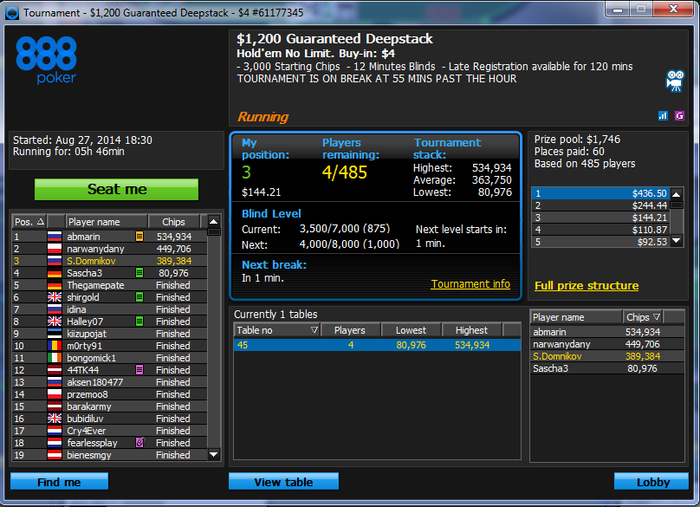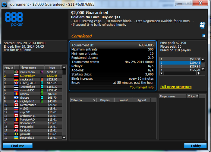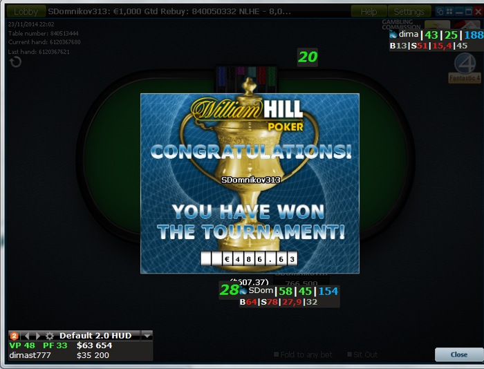 Вроде не плохо поиграл.31 турнир 4 финалки. Хм2 сука всю сессию раздражал.Половина турниров айпокера приходится тейбл финдером искать, так ещё у 888 какие то гоны, худ постоянно уходит за столы, приходилось и на них худ выставлять самому. Сурово в общем. Ещё видать из-за этого гемора с тейбл финдером хм хренова считает турниры, показывает мне что я в 1 турнир залил 350$+ хотя по факту такого не было.