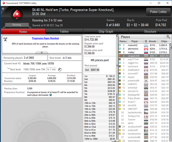 Суббота и Вск 17.15 Lotos 12+ (3r1a закладываю) - в субботу и вск (=56*2) 18.00 PS Big 8.80 в субботу и вск (17.60) 18.30 8+ 1r1a в субботу и вск (48) 19.00 PS Bigger 22 - в субботу и вск (44) 18.15 PS 44 6max progressive SK в субботу (44) 19.22 FTP 25 Double Deuce 2-entry в вск (50)