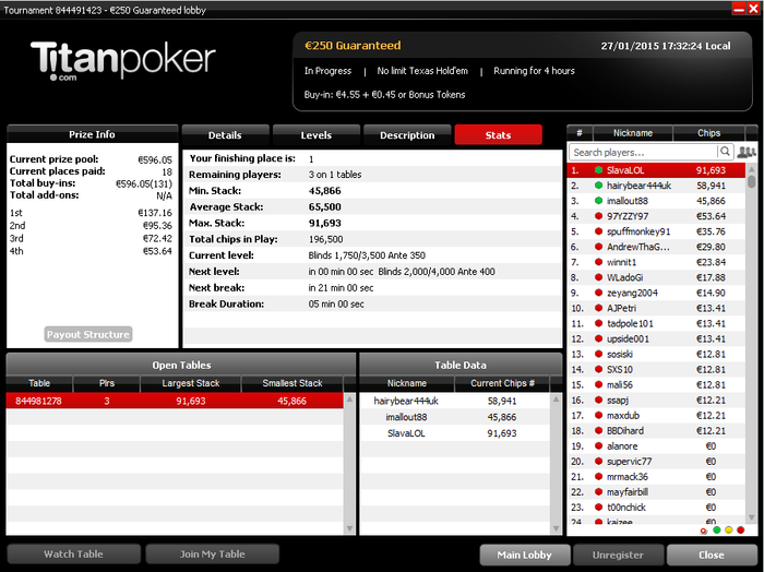 Вчера отдохнул, а сегодня опять проснулся только в час дня, но все же сел немного поиграть. Сыграл турниров 10, хотя понимаю, что это не дело и надо играть более плотными сессиями, но все не могу никак войти в нормальный рабочий режим.