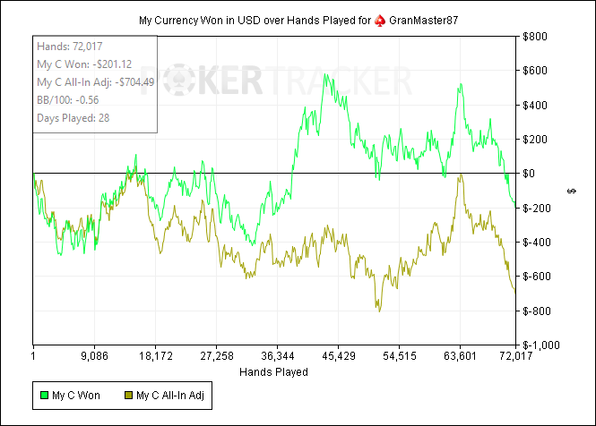 Вот мое творчество: В этом месяце следил за графиком после каждого контбета)-понял, что для меня это не проблема. Когда я минусую, я играю хуже, когда плюсую-лучше, причем зависимость прямая от величины результата, но я и без графика примерно понимаю свой результат в сессии. Поэтом тут нужно решить проблему понижения качества при минусе-займусь в этом месяце. В остальное все, что написано в книге Тендлера-либо для меня не работает, либо я что-то не так делал, либо изменения настолько незначительные, что время, тратящееся на них, не соответствует результату. В этом месяце буду гриндить много (4 стола вместо 3) и работать над своей игрой (эх, сколько раз я уже это говорил и не получалось выполнить) в ущерб интернет-серфингу в выходные дни. Вот список того, что я смотрю каждый свой выходной день: - все, что накопилось на ДТ и покероффе не прочитанного - обзоры основных футбольных матчей еврокубков и европейских чемпионатов - 1 серию Расследования авиакатастроф - 1 серию 1000 способов умереть (недавно открыл для себя прикольный и практический сериал на реальных фактах) - 1 серию TED - блог Форха (начал читать в прошлом году только, позор мне, щас 70 страница) - блог Исполнителя (то же самое) - всякую остальную хрень, на которую натыкаюсь в процессе (например последний раз наткнулся на клонирование-час потрачено ) Нахрен это все (кроме 1 п. и блогов). Хочу завалить себя покером пару месяцев, чтобы устать от него перед отпуском, ну и нормально поработать). К тому же футбольный сезон закончен