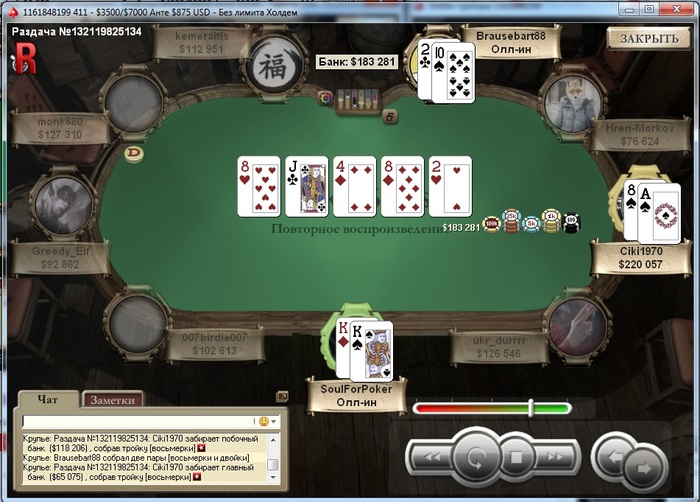 Hren-Morkov префлоп 2 ББ поставил, пол стола уравняло. На флопе серб с А8 рейз, я олын, он колл и сразу сет собрал. Какое разочарование, а я ждал, что ему туз придёт (скандалы, интриги, расследования - показать всё, что скрыто ) Ничего страшного, в следующий раз он обязательно меня тузом переедет, буду ждать