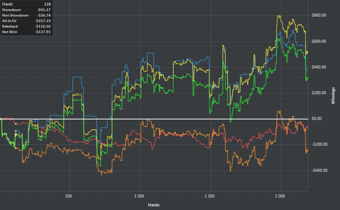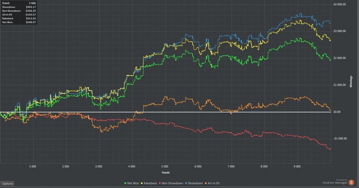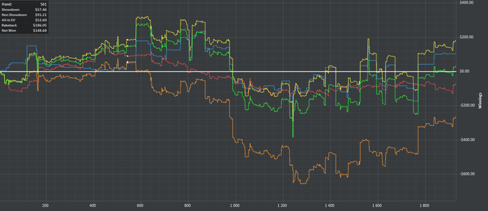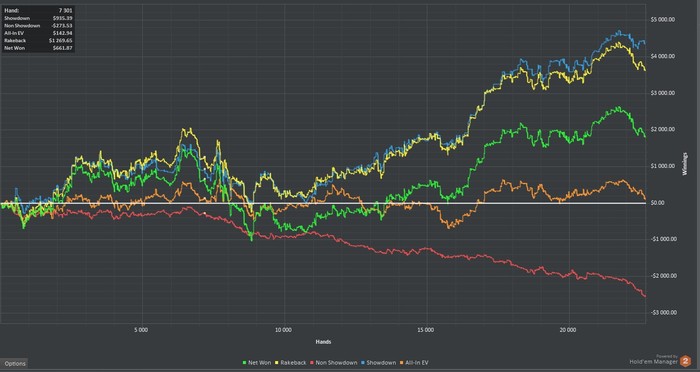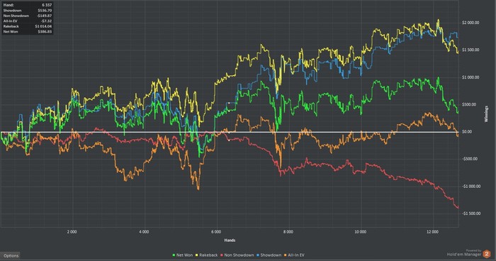 Бонус отмыт, результаты за эти дни. Печальный вывод, что львиная доля профита идет от рейкбека, но видимо это реалии пло100 для игрока с маргинальными навыками игры.Играл 6 макс и ХА, ХА играл с слабым регом на 4-6 столах. С ним мое МО я думаю очень не большое,но близкое к 0, а учитывая кап в 1 евро в МРN это был идеальный вариант намыть море рейка. Так же в ХА попадались пару дисперсионных фишей которые опускали меня на 5-6БИ за 100 рук и убегали Nuff said