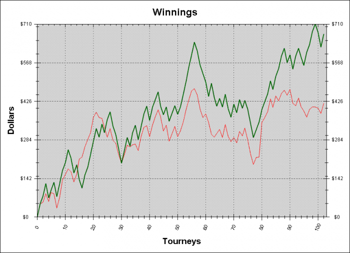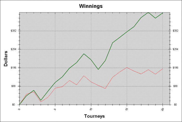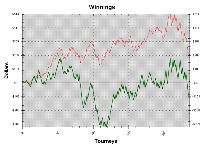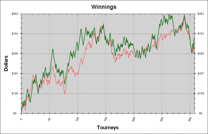 Поиграй супертурбики за пару долларов на фтп, чтобы лучше понять дисперсию - твои 320 турниров вообще не дистанция, чтобы "поныть" ) Тем более, что график вполне оптимистичный. Надеюсь, ты все-таки бьешься не "как рыба об лед", а "как лед об рыбу" )