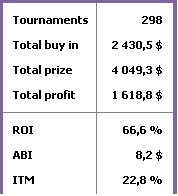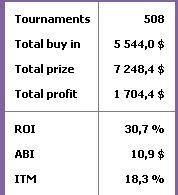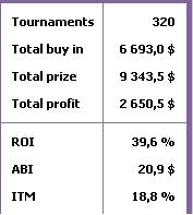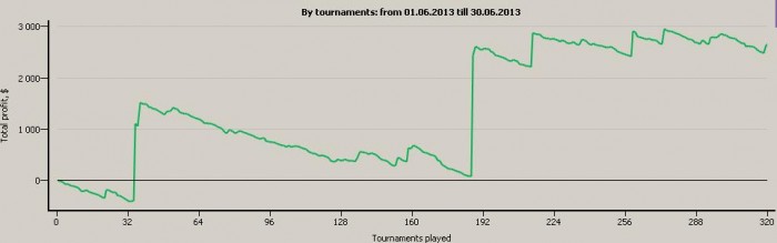 Основных турниров сыграл мало, была возможность побольше. Надо раньше начинать рабочий день, чтобы в расписание входили все возможные турниры. Плюс двух покер-румов недостаточно для набора дистанции, буду подключать еще новые. Только вот вопрос какие именно. Профит положительный, если бы соизволил сыграть запланированную дистанцию, возможно получилось бы его увеличить. Радует, что размер среднего бай-ина поднялся. Следующий скачок этого показателя будет заметнее.