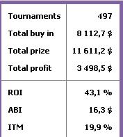 Дистанция - 600 турниров средний, аби 20$ (320 турниров, аби 20,9$) Дистанция на PokerStars - 500 турниров средний, аби 5$ (168 турниров, аби 7,1$) Чистый профит по всем румам - 4000$ (2784$)