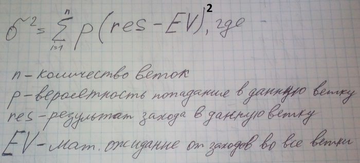 Рави , ты не согласен с этими рассчётами? Почему ты считаешь дисперсии различными? То , что мат. ожидание обеих стратегий при данных условиях одинаково и равно +1.2 банка все давно подтвердили.
