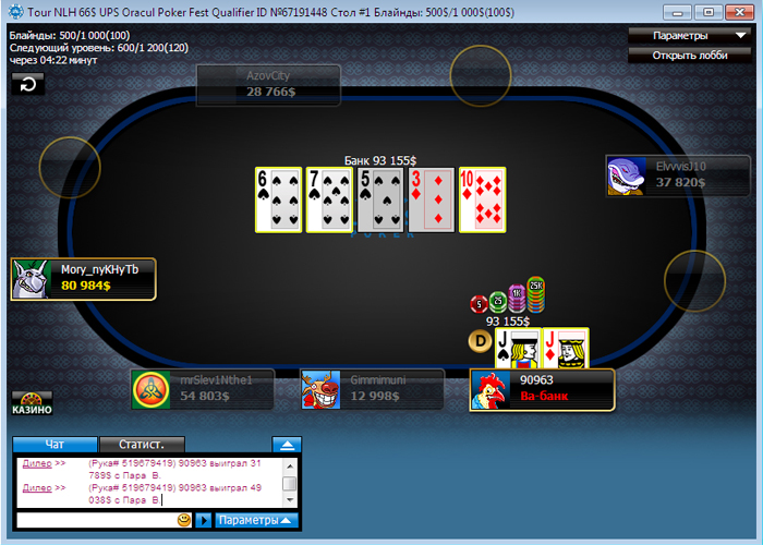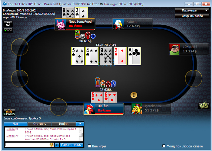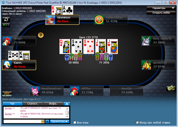 "Mory_nyKHyTb" поглотил примерно 25-тысячный стек с сетом восьмерок против непонятно чего, и фактически догнал по фишкам "igorek5555". У обоих сейчас в районе 70К. Причем, один сидит слева от меня, а другой - справа. И ведь картона нет! Что, черт возьми, за несправедливость?