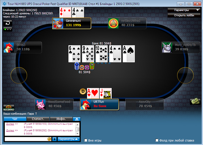 Конечно, когда у тебя после двух проигранных олл-инов остается чуть больше 1ББ, уже не думаешь о своей турнирной судьбе. Но определенные поводы для оптимизма были. Во-первых, это крайняя пассивность всех игроков, что позволило мне спокойно пережидать круг, имея за душой 3ББ. Во-вторых, крайняя активность "Gimmimuni", который готов был закрывать мой любой олл-ин. Я понимал, что меньше чем 65/35 с ним не выставлюсь, - и пихал в него даже через весь стол, как, например, в случае с - и получил колл от . Ведь, несмотря на все эти чудо-удвоения, у меня все равно оставался самый короткий стек за столом...