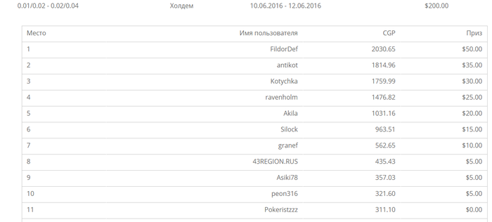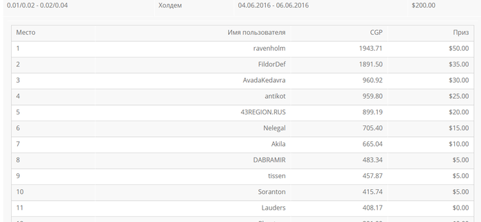 В 3 этапе занял 4 место: Ну тут по очкам видно, что катать становится тяжелее. Стал немного подключать нл10, но в этой группе вообще творится идиотизм. Сами посудите: в 1 группе играются лимиты нл2-нл4, разрыв между лимитами в 2 раза. Во 2 группе играются лимиты нл10-нл100, разрыв между лимитами в 10 раз!!!! Вот и получается, что люди которые 3 дня без перерыва на еду, отдых, секс, молитву катали нл10, оказались в жопе, после того как в последний день пришли какие-то дяди, сели на нл100 и за пару тройку часов заняли половину ТОПа.