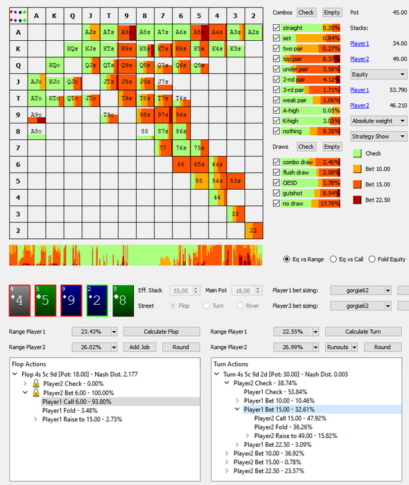 gorgia61, привет. Я смотрел в гто-бейз. Там только 75бб, но там сайзинг префлопа 10бб (а соперник сыграл 9бб), поэтому по спрам выйдет не такая сильная разница.