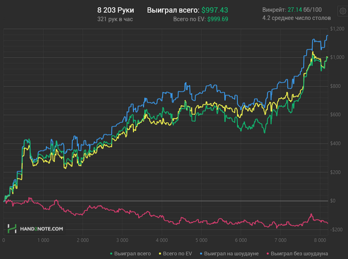вообще реги тут какую-то фигню творят, когда можно просто с фишами играть. Часто вижу рубилово, как на чико, из 5 регов без фиша за столом, или хедзап зарубу. И не удивительно, что встретил только 2-3 человека с плюсовым винрейтом по х2н за всё время в руме.