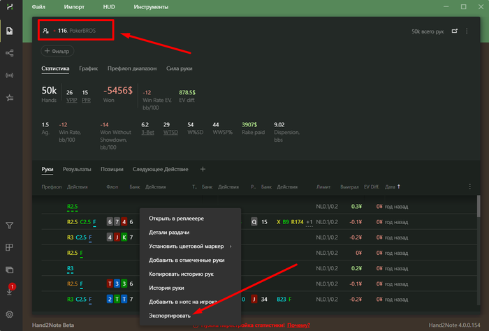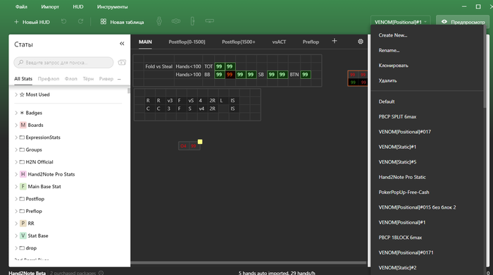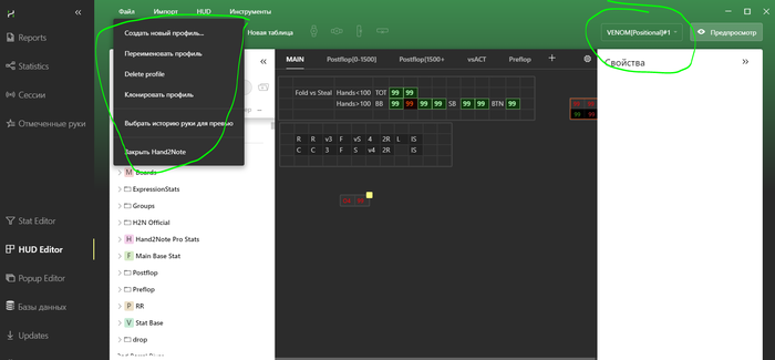 HUD сменяется нажатием на иконку Hand2Note за столом -> Switch Profile и выбором нужного провиля. Попап можно сменить при открытом попапе на любого игрока, нажав на иконку шестеренки -> Switch Profile:"