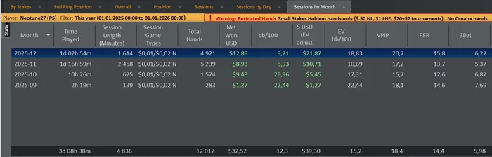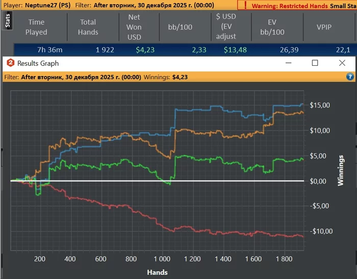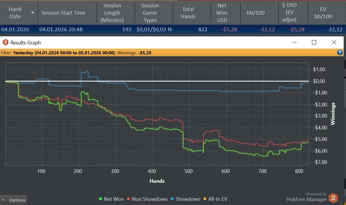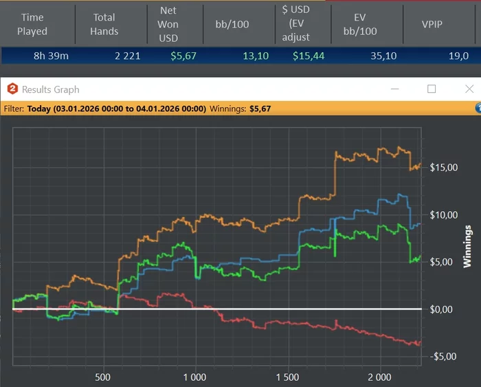 Давно таких сессий не испытывал.. 😅 Депнул 5$, иногда поигрывал с телефона. А недавно взял б/у ноут и теперь даже хм2 установил, но без своего хада ) Сейчас играю нл2, но я немного раскрутился и возможно скоро буду шотать нл5. Хотя может будет не просто, потому что я все позабывал, что префлоп, что постфлоп, так и еще селект убрали) Вобщем буду покатывать по возможности, а там будет видно. Еще пролетают мысли и иногда желание вникнуть в мтт, возможно в будущем, но сейчас не реально турниры играть, но билетики за квесты коплю.. А все это пошло с того, что мне хочется, когда то в будущем, поиграть оффлай покер, побывать в этой атмосфере.. Всех с наступающим Новым Годом, всем ГЛ!)