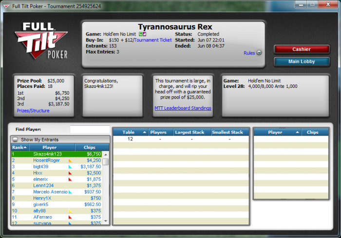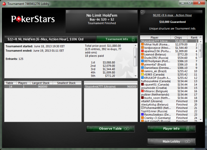 MP2 crnagora71 (6,030) 201bb MP3 Bushman (8,925) 298bb CO Skazo4nik777 (4,572) 152bb BTN MagicGog (