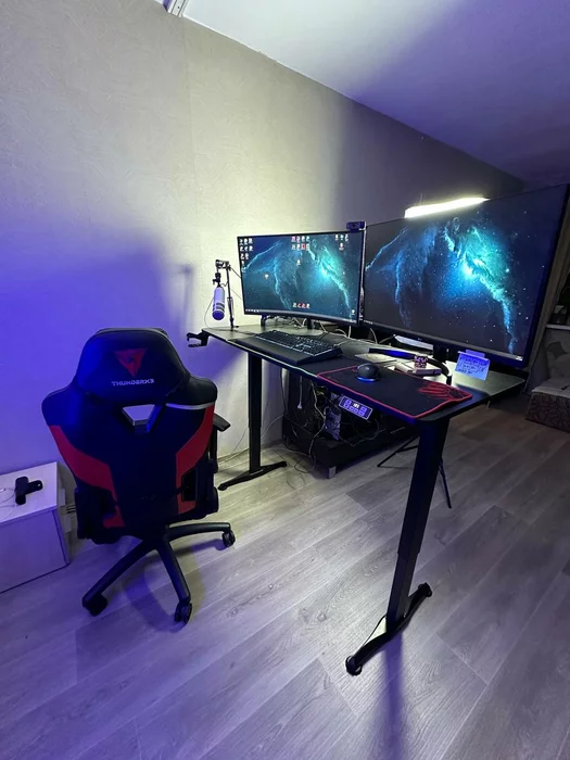 У самого стол с подъемным механизмом, миркрофоном и кронштеном для него, 2мя мониторами и удобным эргономическим креслом ( недавно обновил его т.к.сессии по 10+ часов). Удачи!