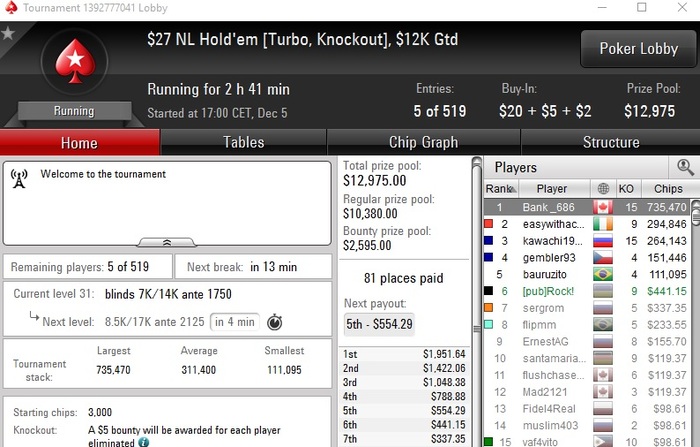 Отыграл сегодня 33 турнира в +1300$ Это какой-то пробой в ауре... Выше 6-го места просто нереально забраться... Сел за финалку чипаком AKs<1010; 33<AA... Играл хорошо но сдавали просто ад какой-то... В воскресенье плюсанул- уже хорошо! Турниров всего: 531/1000 Профит: +2551$