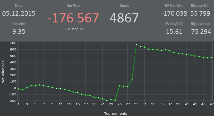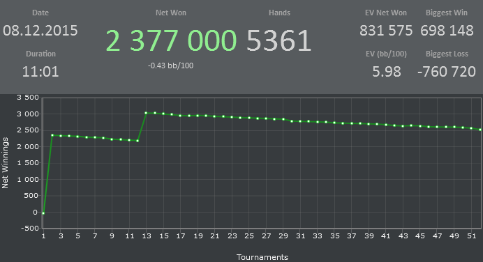 Играл довольно таки неплохо, но местами подтильтовывал... Из-за этого на троечку. Турниров всего: 451/1000 Профит: +1126$