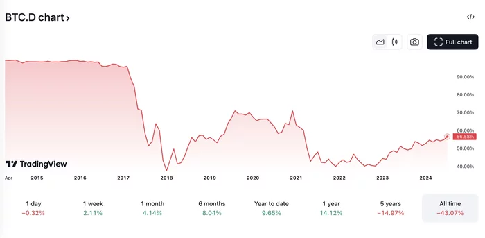 Доминация битка упала до 40% во время хайпа 17го, когда все начали "ваять" альткоины, включая эфир.