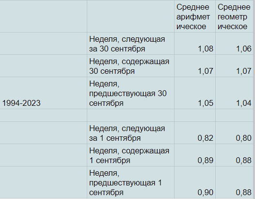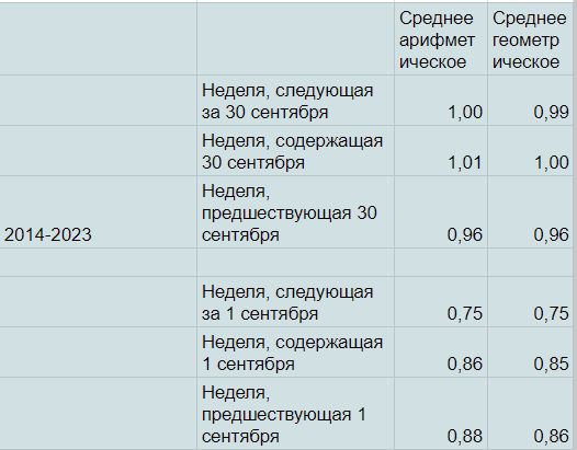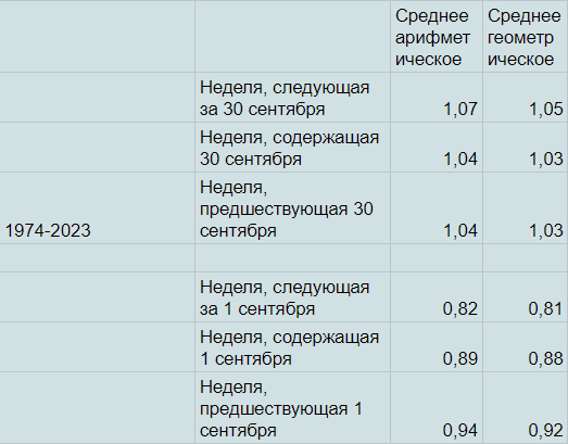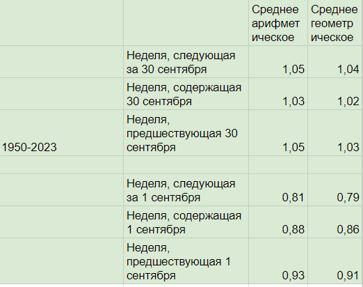 Нет, речь про итоговый результат за промежуток. Иными словами, произведение финрезов сентябрей по отдельности. В каждом десятилетии были и плюсовые и минусовые сентябри, вторых как правило больше.