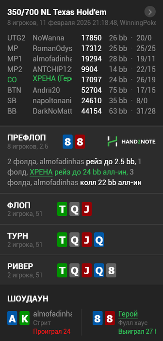 Ваши версии гораздо интереснее реальности в которой глюканул рум и при отлично работающем интернете я потерял почти весь тайм банк еще на флопе, на терн дисконект повторился
