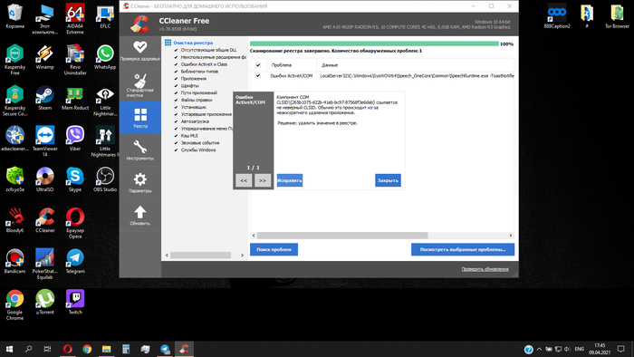 очистить кэш и исправить ошибки реестра при помощи CCleaner,