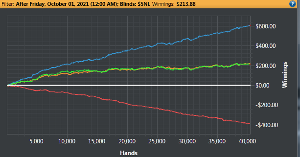 Последние три дня месяца здоровье не позволило отыграть еще больше,к сожалению. И поэтому строить какие то планы на следующий месяц немного глупо. Если я отыграю хотя бы на 3/4 от октябрьского,то буду безумно рад. Выше подниматься тоже пока не планирую,цель отыграть 100к рук на нл5 и оценить винрейт ,остается прежней. Всем удачи!