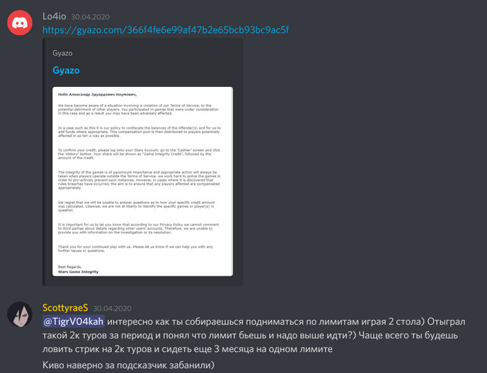 Ну и раз в твоей системе координат ты белый и пушистый, а я хуесос который обсирает других за спиной, просто из любопытства - когда Лочио выложил скрин с рефандом от старсов