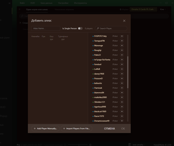 Когда я создаю алиас ники игроков есть, но в отчётах ни одного ника нету. Во время игры худ есть но импорта рук нету, всё время на всех 0 рук