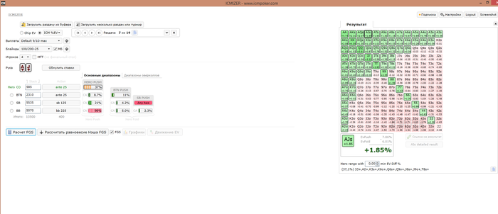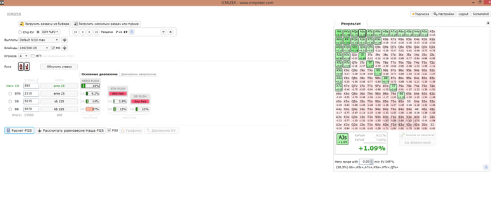 Доброго времени суток, уважаемый разработчик программы Icmizer. С удовольствием использую вашу программу для улучшения своей игры. Возник один вопросик, надеюсь в нем разобраться. Итак, для анализа пуш/фолда на финальном столе 90/180 макс турнира я использую спектры FGS равновесия Нэша. Загружаю руку из HM, и нажимаю "Расчитать равновесие Нэша FGS" Программа выдает спектр: Пример 1