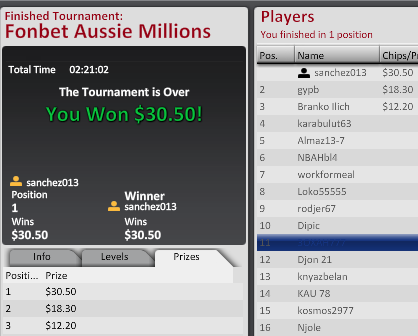 На фонбете буду продолжать играть по БР!Там сейчас около 300$.Играю там сейчас серию отборочных турниров ,которые проходят один раз в день и по итогам месяца 9 лучших получат билеты на Aussie Online Final