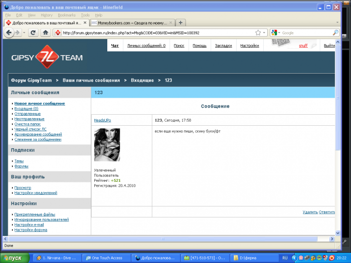 Всем привет. Не буду сразу кидать обвинений что этот человек кидок, прошло еще не так много времени что бы делать такие выводы о человеке с такой репутацией, но то что он делает оч похоже именно на это. Вчера я создал тему об обмене 1к вмз на 1к любой другой платежной системы, после пары другой сообщений от кидал написал мне пользователь с ником HeadsUPo и предложил обмен на мб, в размере 450 на что я естественно согласился, предложил Bangertа в качестве гаранта но того не было в сети и вообщем исходя из его профиля не было причин сомневатся в его честности, оч много плюсов за обмены что не оставляет поводов для сомнений.hhttps://forum.gipsyteam.ru/index.php?viewtopic=10291. .Выложу переписку полностью, конечно много лишнего но это открывает полную картину