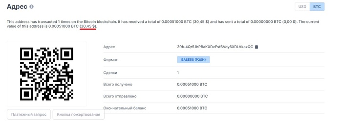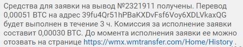 Я учёл минимальный порог Webmoney и выбрал опцию "депозит 30$ через Bitcoin". К оплате было 0.00050325 BTC.