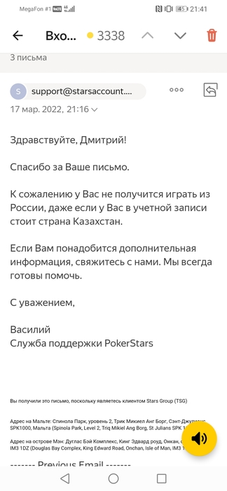 Писал вышеупомянутым я уже со своего пк на почту (советую на support@starsaccount.com на англ.), салам алейкум я переехал в кз и т.п, приклепляю подтверждающий документ.