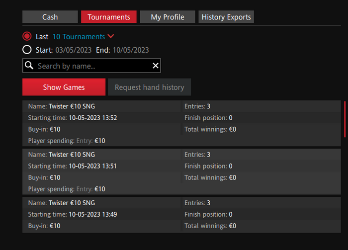 - Примеры турниров (название, баин, время, часовой пояс)/кэш игр (лимиты, время, раздача, часовой пояс), где была данная ситуация - полный скриншот стола, или скрин из истории игр так же подходит;