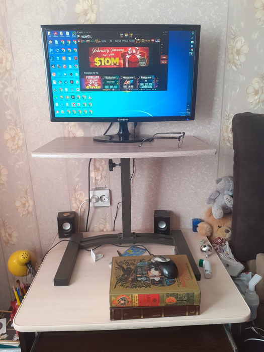 LittlePig, круто,спасибо,интересная идея. Года два назад я уже думал про это,но супруга только только купила новый стол,что я не решился эту тему развивать. Сейчас дуиаю,что можно поискать такой стол. А я то уэе стал задумываться о ноутбуке,чтоб лежа играть и просить помощи в подборке минимальной конфигурации для игры на 4 столах зума в покерке,что то подешевле конечно же)