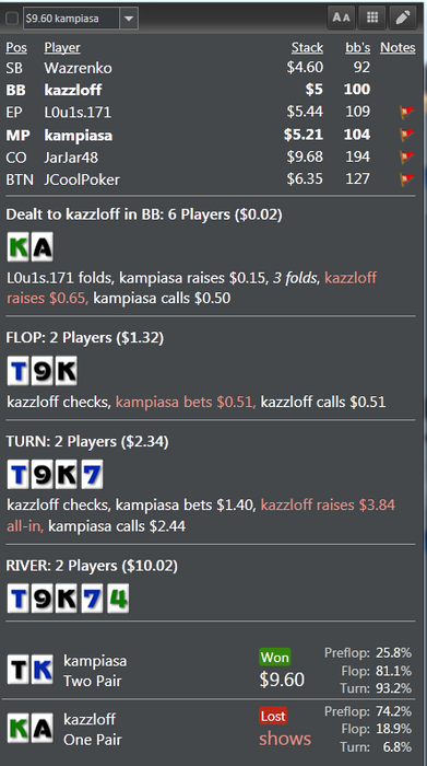 Дальше играю против фишеватого. Думал-думал сколько поставить кбет на флопе да так и не придумал,решил в итоге,что с тузом в масть сыграю от чек колла. Хз,но по мне снова кулер)