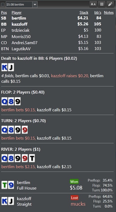 Здесь не могу не поставить терн тем более против почти неизвестного,предположительно фишеватого,получаю рейз ,начинаю думать, в голове крутится,что закрылись 78с, закрылись две пары Т9с. Потом смотрю на шансы банка в 25% и вдруг осеняет,что к этим комбам сильнее меня там может оказаться и какие топ-пары или даже оверпара валетов,дрова тоже никто не отменял. И безо всякого подсчета вдруг верю в то,что мне хватит тут на колл. К тому же вечный аргумент-ну не все же время выкидывать то такое