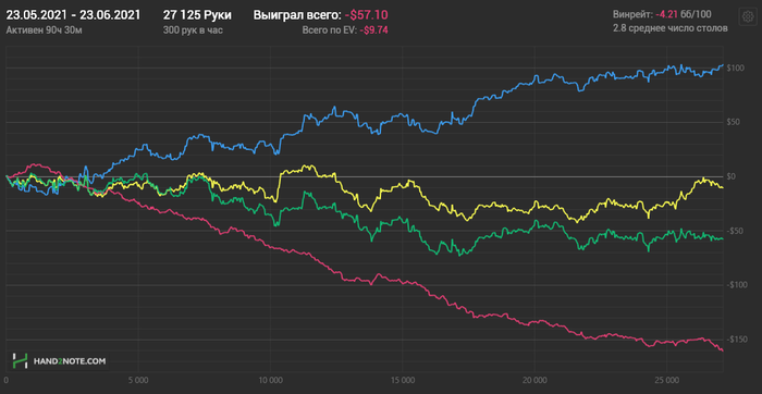 Вечером уже не так хороша сессия. Шло все хорошо, +1 БИ. Потом кулер 666КК -> ККК66. Потом не очень удачно сыграл и стек отдал. А потом протелефонил ставки оппа-фиша (в т.ч. рейз на флопе) в мультипоте и отдал бОльшую часть стека снова . На шд посмотрел на сет и подумал "А что я там хотел увидеть?". Собственно, по его линии там и не было ничего хуже...