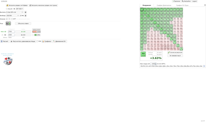 Как известно, в турнирах баббл фактор всегда больше 1, поэтому разбирать по возможности стоит с учетом ICM. Многие MTT игроки не в курсе, что существует софт, позволяющий это делать, и по старинке считают в чип ЕВ. Ну очевидно, что если колл алл-ина на баббле сделать по чипЕВ, то наш диапазон может оказаться в 2-3 раза шире, чем того диктует турнирная ситуация.